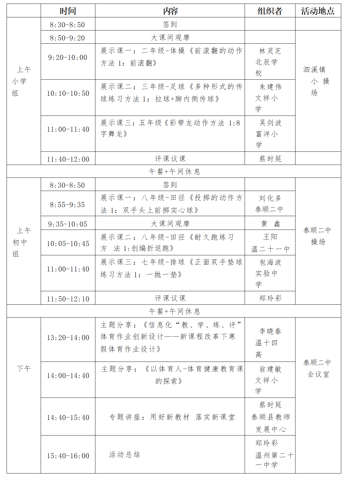 1.本次活动由泰顺县泗溪镇中心小学、泰顺县第二中学承 办,请做好上课场地、器材设施的准备等工作。